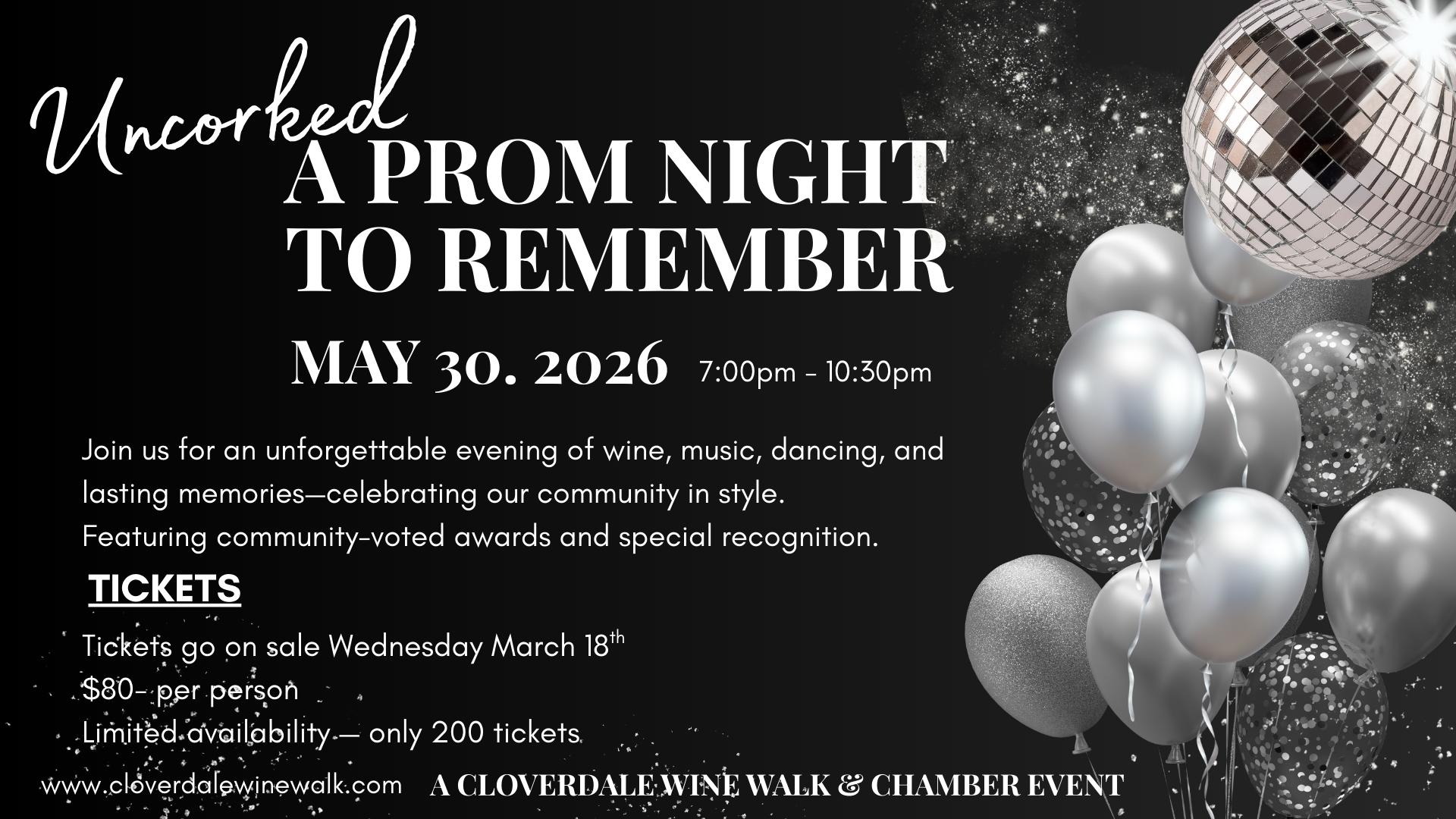 Join us for Uncorked: A Prom Night to Remember — the Cloverdale Wine Walk’s adults-only celebration and fundraiser for the Cloverdale Chamber of Commerce.